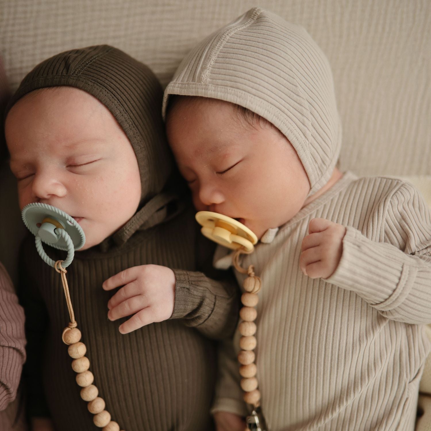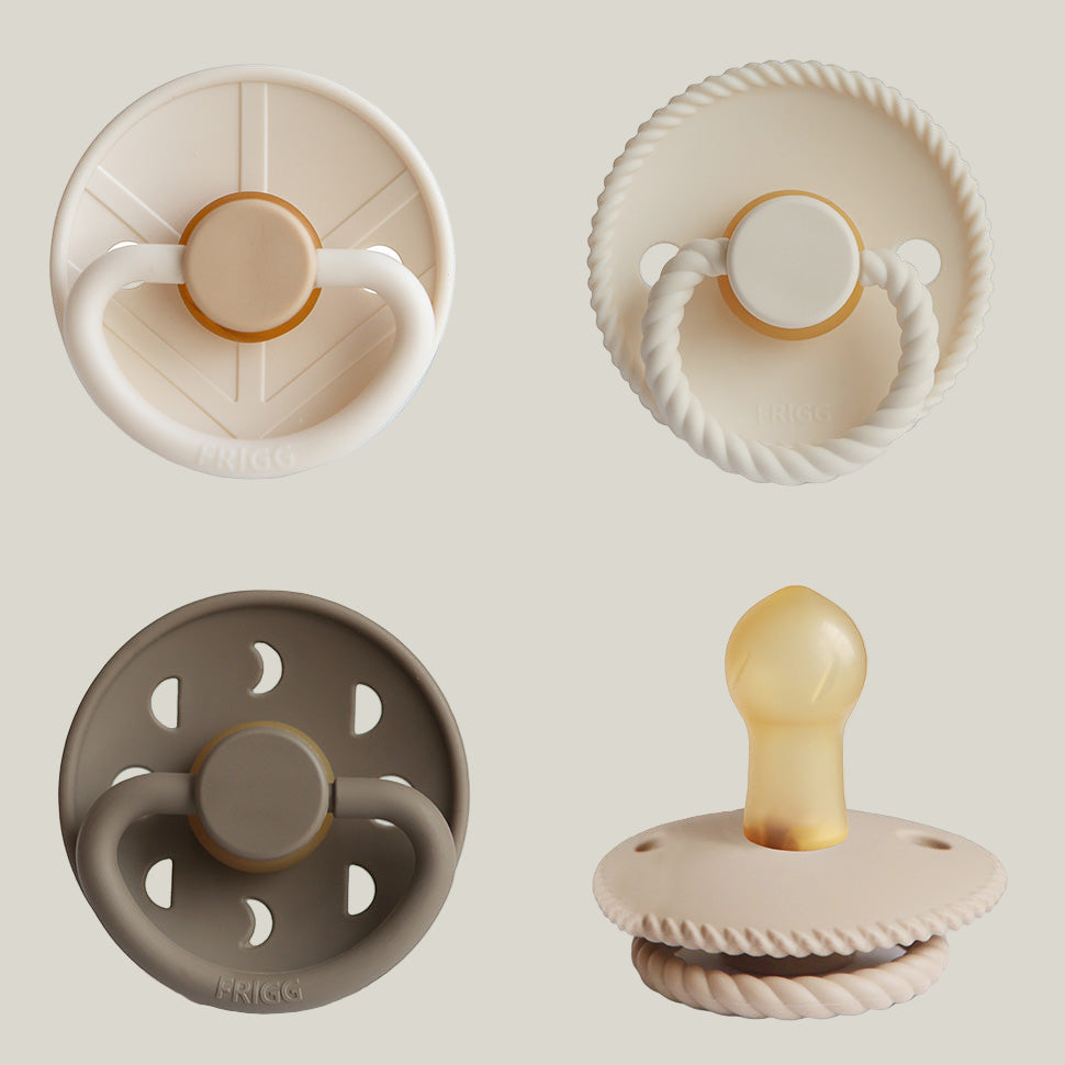 The FRIGG line of natural rubber pacifiers have been thoughtfully designed for your baby's comfort. The outward curve keeps the pacifier off their delicate skin, while features like air holes and a security handle ensure your baby stays safe. Available in a range of soft colors, FRIGG pacifiers make a beautiful addition to your collection of baby essentials.