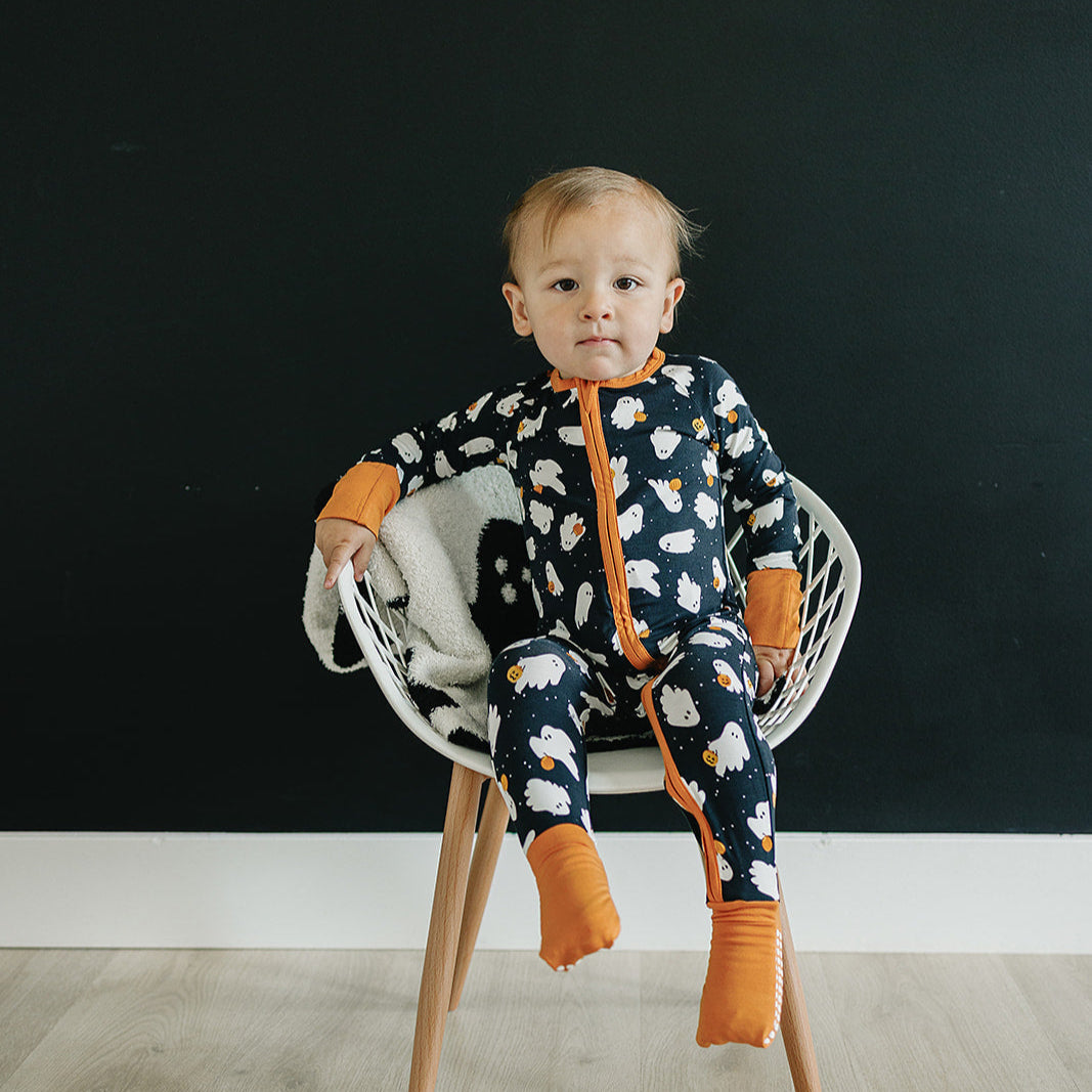 Introduce your little one to the cozy and stylish world of the Ghosts Bamboo Zipper by Mebie Baby. Designed for babies aged 0-3 to 18 months, this adorable sleeper features a fun Halloween pumpkin print that adds a touch of festive charm to your baby’s wardrobe. Crafted from ultra-soft, breathable bamboo fabric, this zipper onesie ensures your baby stays comfortable throughout the day and night. The convenient double zipper allows for quick and easy diaper changes, while the handcuffs on the hands and feet extend its usability as your child grows. Additionally, the foot grips provide extra stability for little ones who are just starting to move around. Whether it’s for a nap or playtime, the Ghosts Bamboo Zipper is the perfect blend of comfort, convenience, and cuteness. Add this seasonal essential to your baby’s collection and enjoy the peace of mind that comes with quality and style.