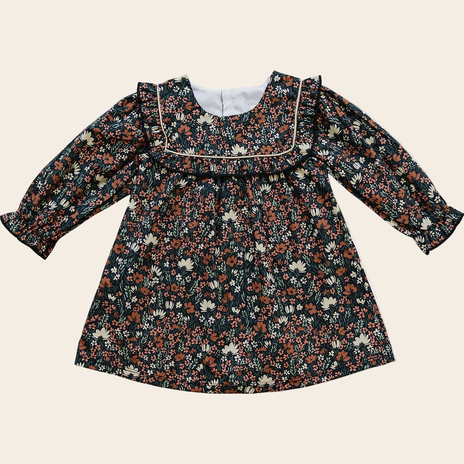 Our Midnight Meadow Dress is a sweet and comfortable choice for your little one’s wardrobe. Made from soft, breathable cotton, it features a lovely floral pattern and comes with matching bloomers through size 3T.