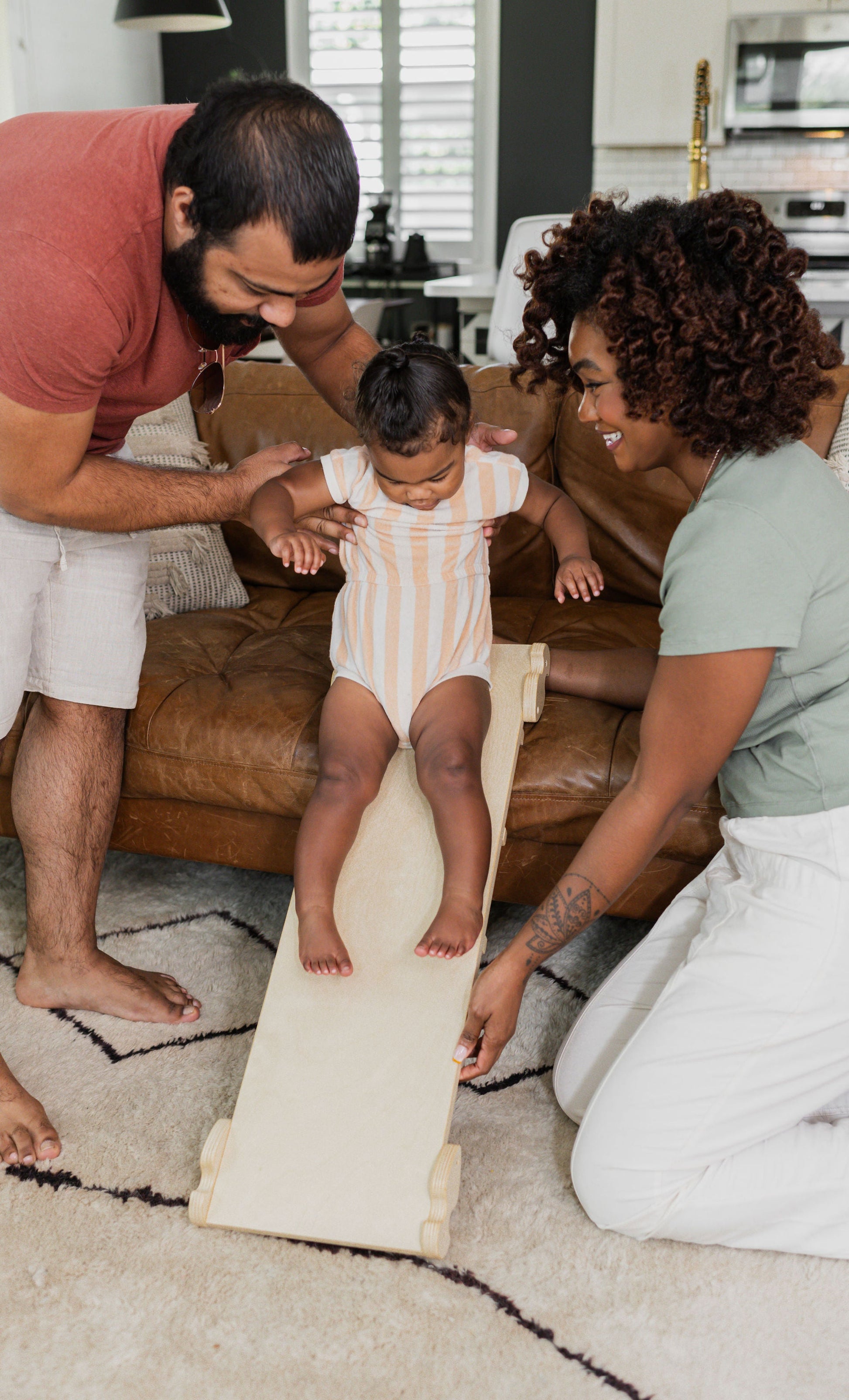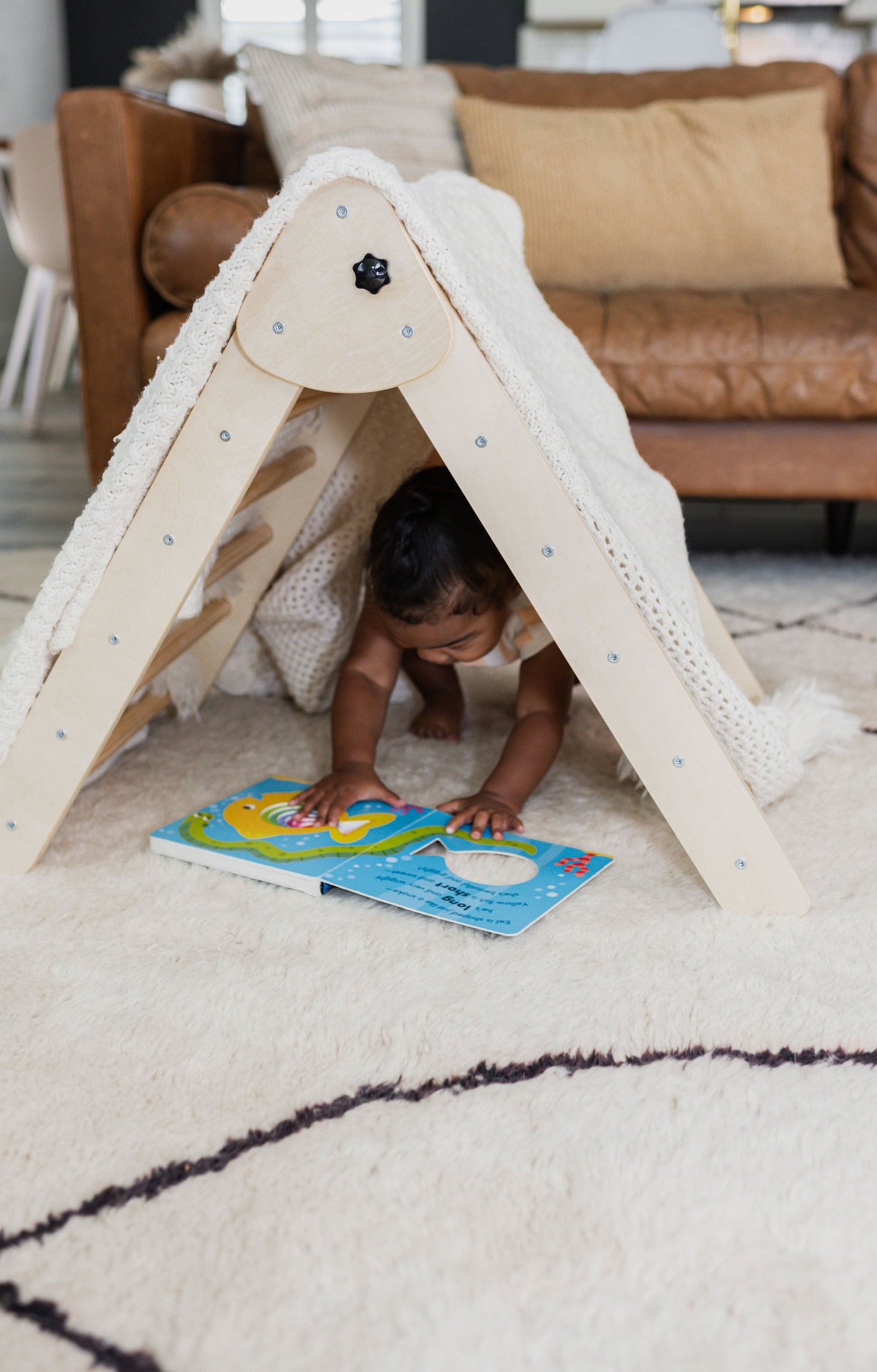 This climbing triangle encourages your little one to freely explore in a safe environment, fostering self-confidence and body autonomy. This wooden Pikler-inspired climber enhances balance control, develops motor skills, and encourages active and imaginative play. Get ready for endless fun! It can be used for climbing, sliding, building bridges, creating forts, and more.