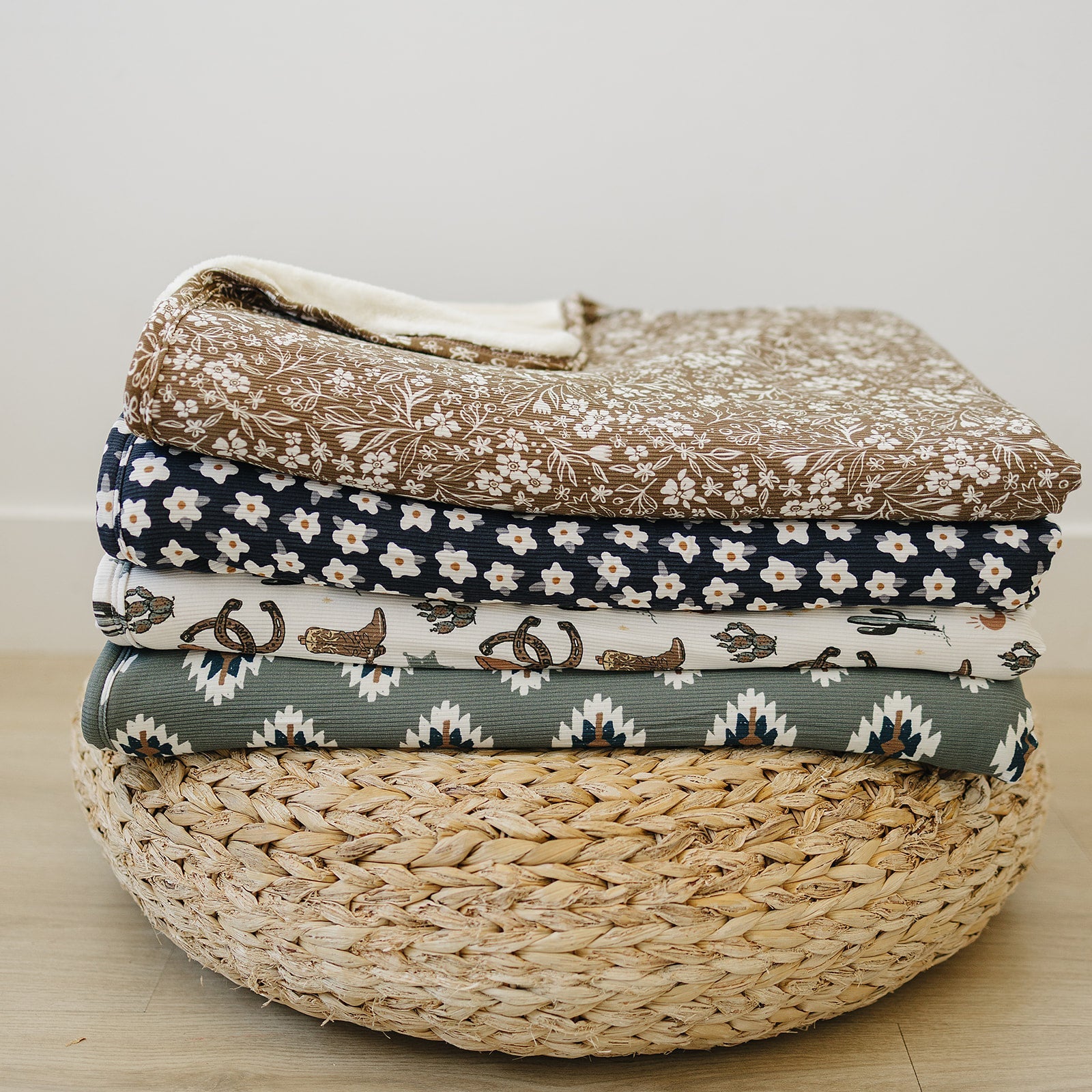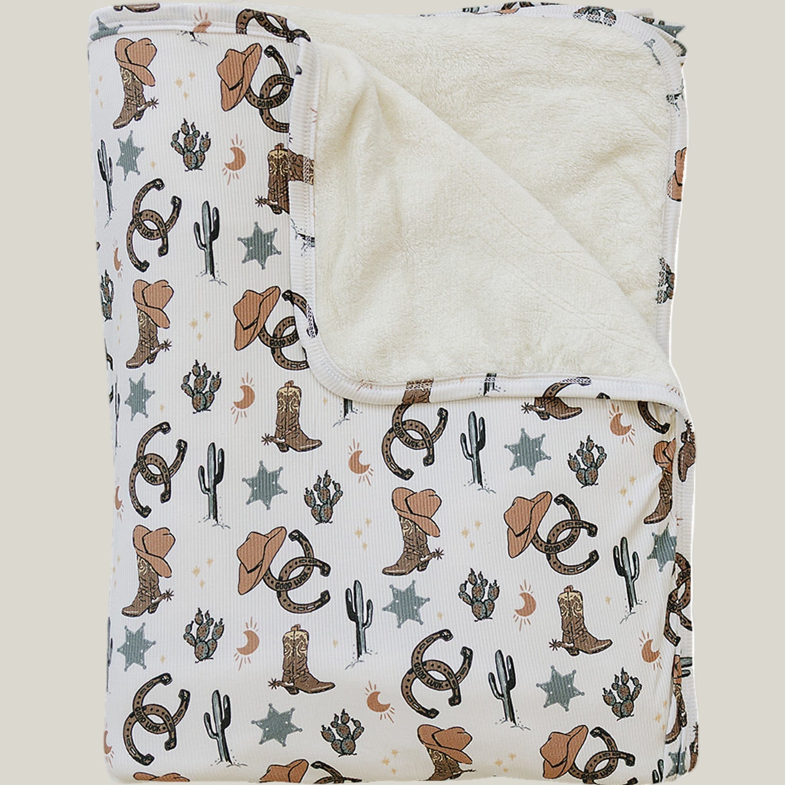 Introducing our Outlaw Cowboy Bamboo Fleece Quilt, featuring a stylish western print. One side is crafted from soft, breathable bamboo material, while the other side boasts cozy fleece for ultimate warmth and comfort. Perfect for adding a touch of style and coziness to your baby's nursery. Shop now for the ideal blend of elegance and comfort!