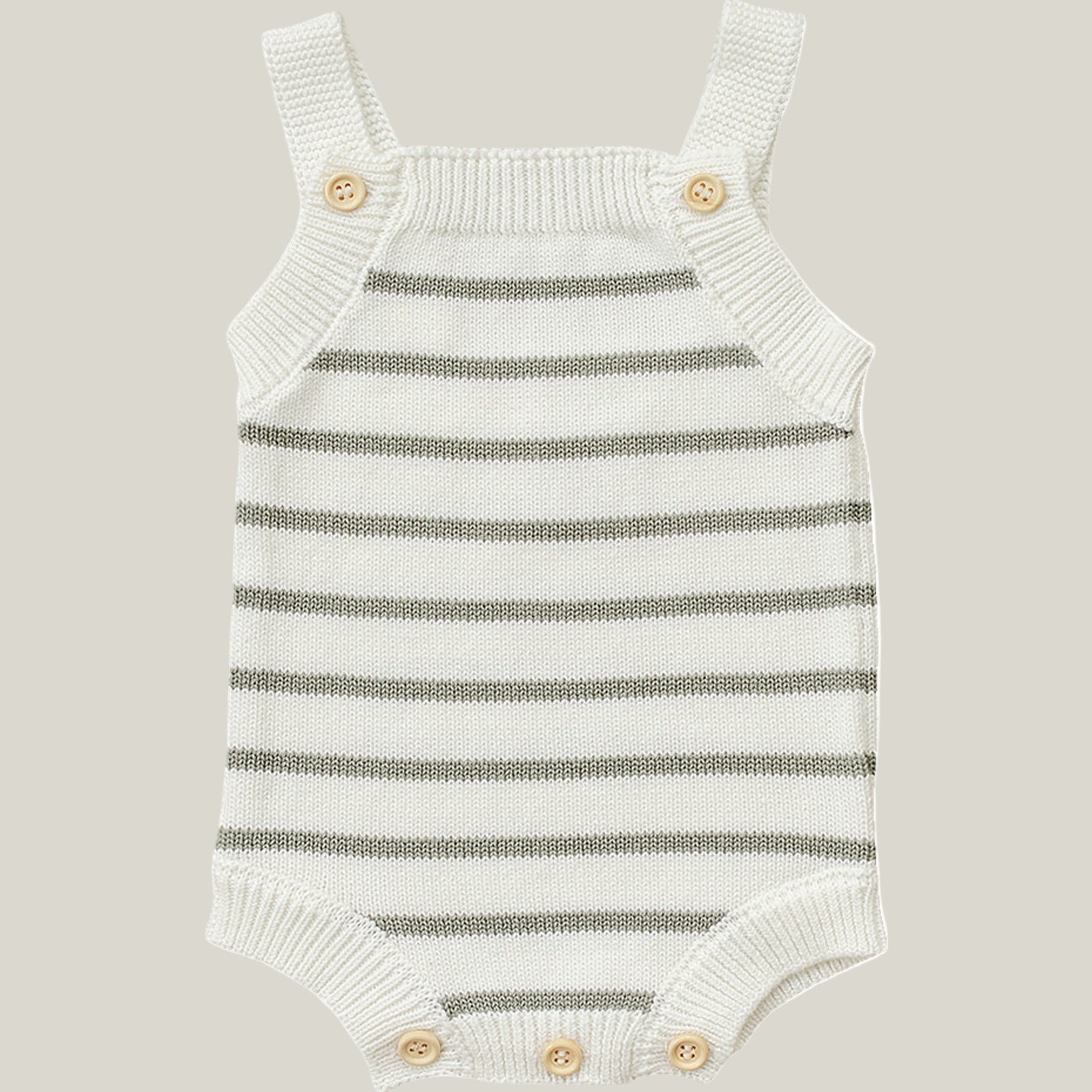 Keep your little one comfortable and cute with our Sage Stripe Knit Bubble Romper. Made from soft, breathable fabric, it’s the perfect balance of style and ease. The charming sage and white stripes add a fresh touch to the classic bubble silhouette. With snap closures at the bottom, diaper changes are made simple.