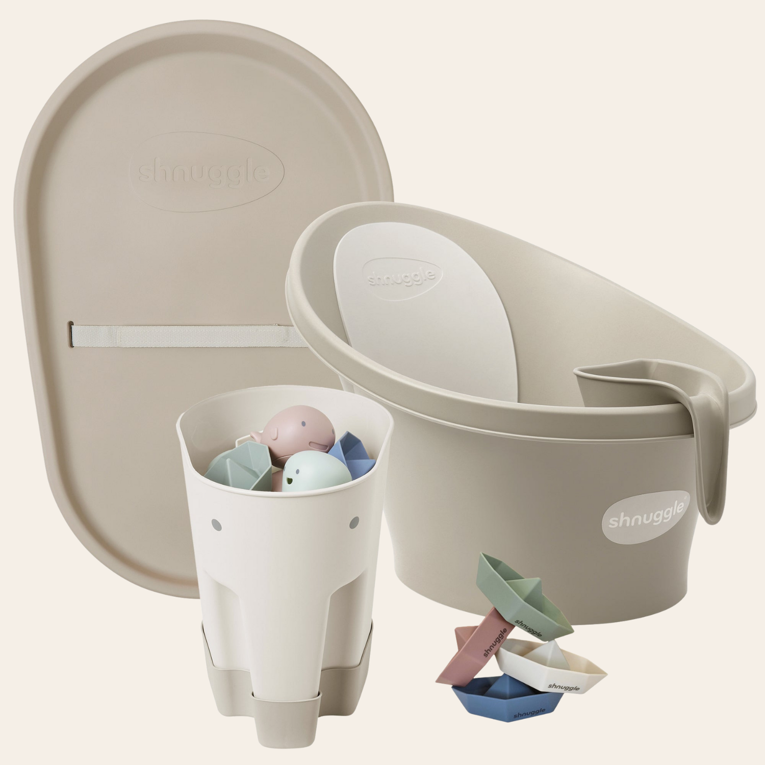 Shnuggle Bathtime Essentials Bundle | Baby Bath, Rinse Jug, Ellie Toy Scoop, Toy Boats & Squishy Changing Mat - Taupe
