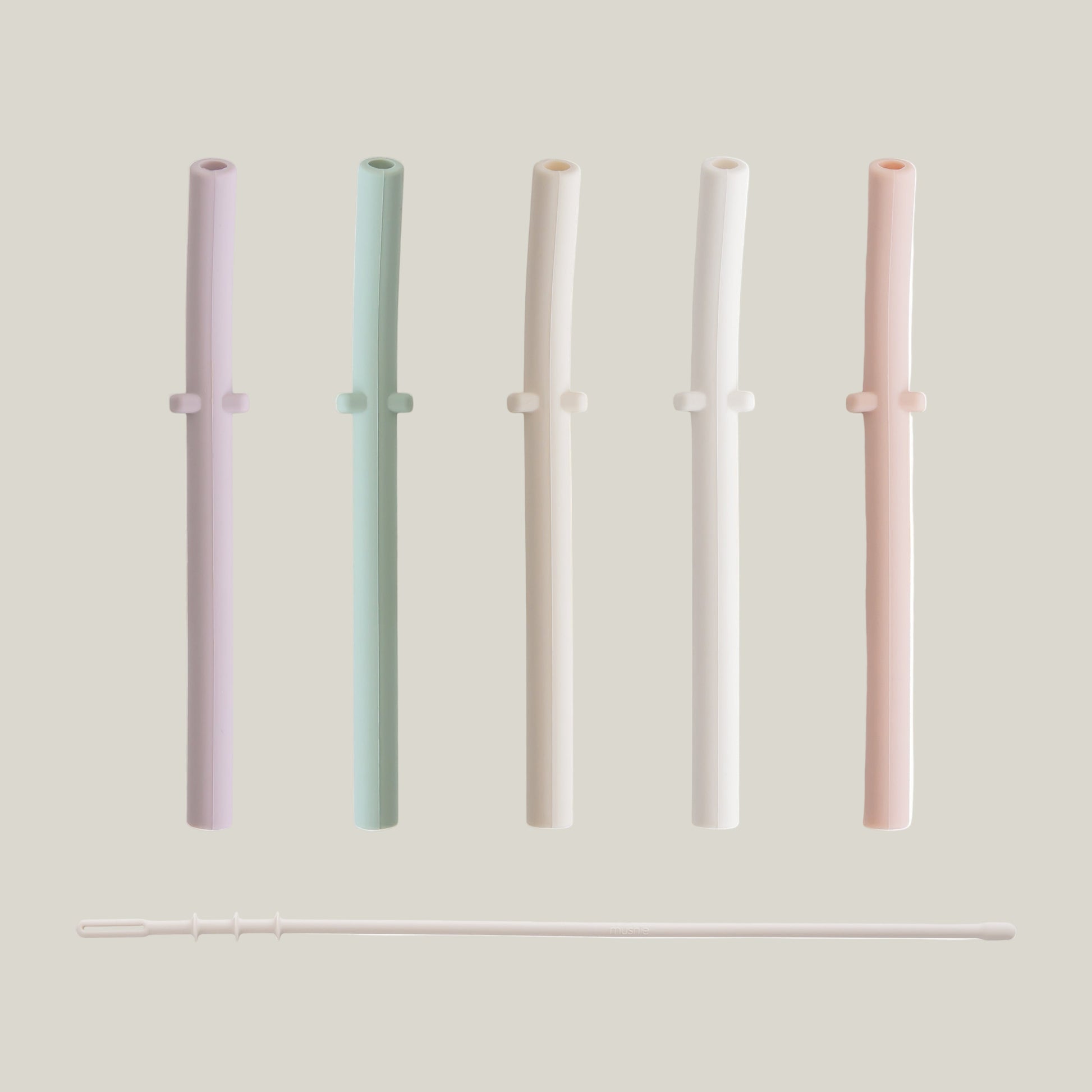 This set of 5 silicone replacement straws is designed specifically for the Mushie silicone training cup, offering a convenient, reusable and safe drinking solution for littles. Made from non-toxic, food-grade silicone, the straws are gentle on gums and emerging teeth. A silicone cleaning brush perfectly sized for the straws makes it easy to keep them hygienic and ready for use. Each set includes 5 different color straws.