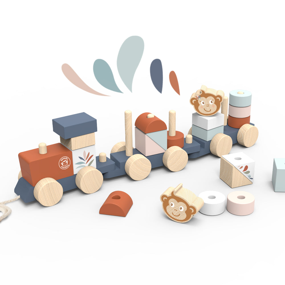 A fun wooden pull-along train stacker, painted in trending soft colors and featuring our favorite character, the monkey.Your little one will have hours of fun, stacking elements on the train and building houses with colorful blocks. Once everyone on board, tchu tchu off goes the train for a new adventure!