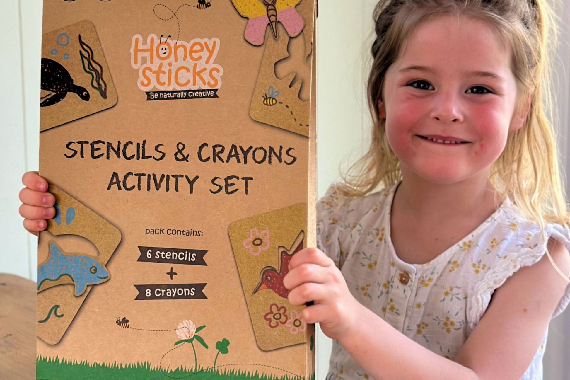 Introducing our handy Activity Set – featuring fun mega stencils! Includes an eight-pack of our best-selling Honeysticks pure beeswax crayons along with 6 fun jumbo-size stencils. One buzz-worthy gifting bundle; safer for kids, gentle on the planet.