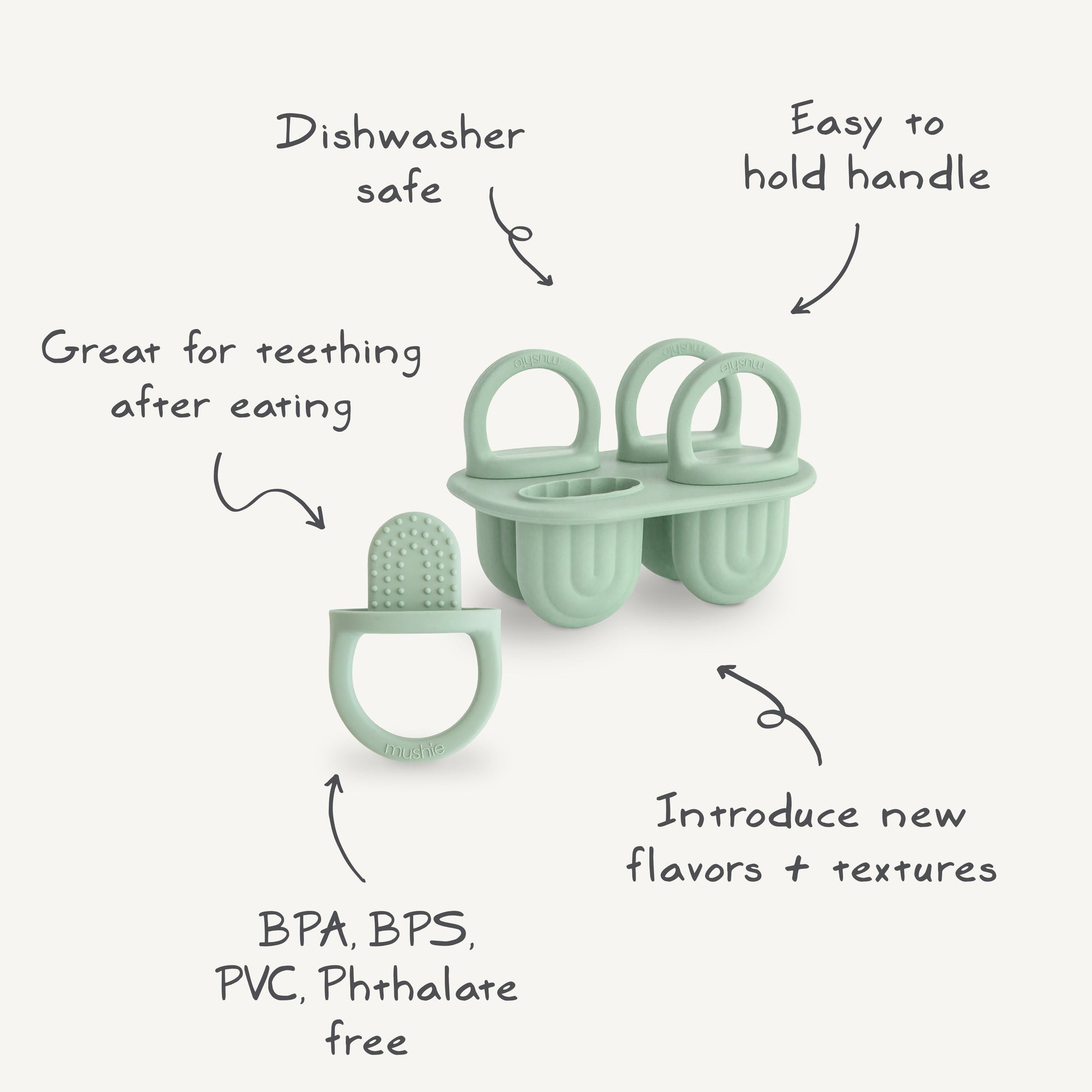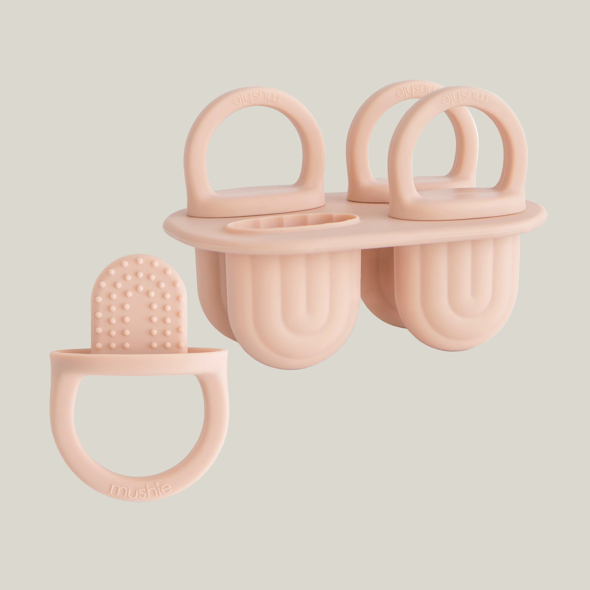Brighten up snack time with the Mushie toddler ice pop tray. Featuring four compartments that create adorable rainbow-shaped popsicles. The food grade silicone tray is flexible, making it quick and easy to remove each pop. Littles can easily hold onto the small silicone handles and practice independent feeding. Perfect for creating healthy treats at home and introducing new flavors and textures. Dishwasher safe for hassle-free clean up.