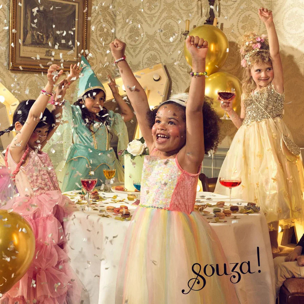 Step into a world of elegance and enchantment with the Victoria Dress by Souza. Crafted for little ones aged 3–4 / 5-7 years, this costume transforms any day into a royal affair. The dress features a shimmering golden bodice adorned with delicate puffed sleeves, exuding timeless charm. A voluminous skirt made of soft, shiny tulle adds a touch of magic, making it perfect for birthdays, dress-up play, or any occasion where dreams come true.